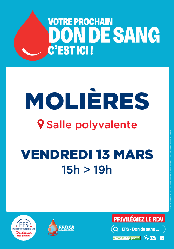 Don de sang à Molières le vendredi 13 mars de 15h00 à 19h00 à la salle polyvalente