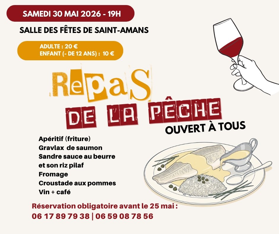 L'AAPPMA Vazerac Labarthe Molières organise son traditionnel repas, à la salle des fêtes de Saint-Artémie, le 30 mai prochain à 19h.