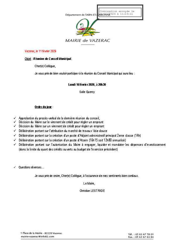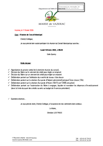 Réunion du conseil municipal ce lundi 16 février à 20h30 salle quercy